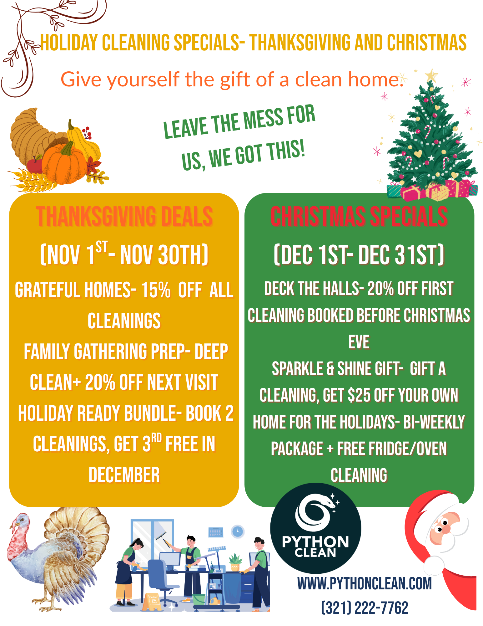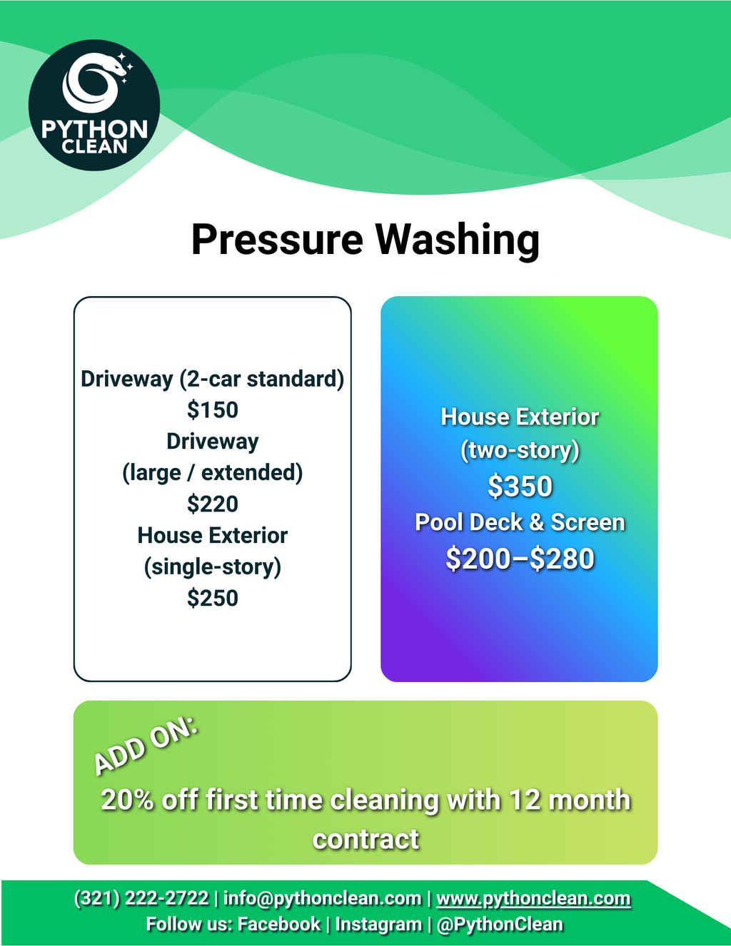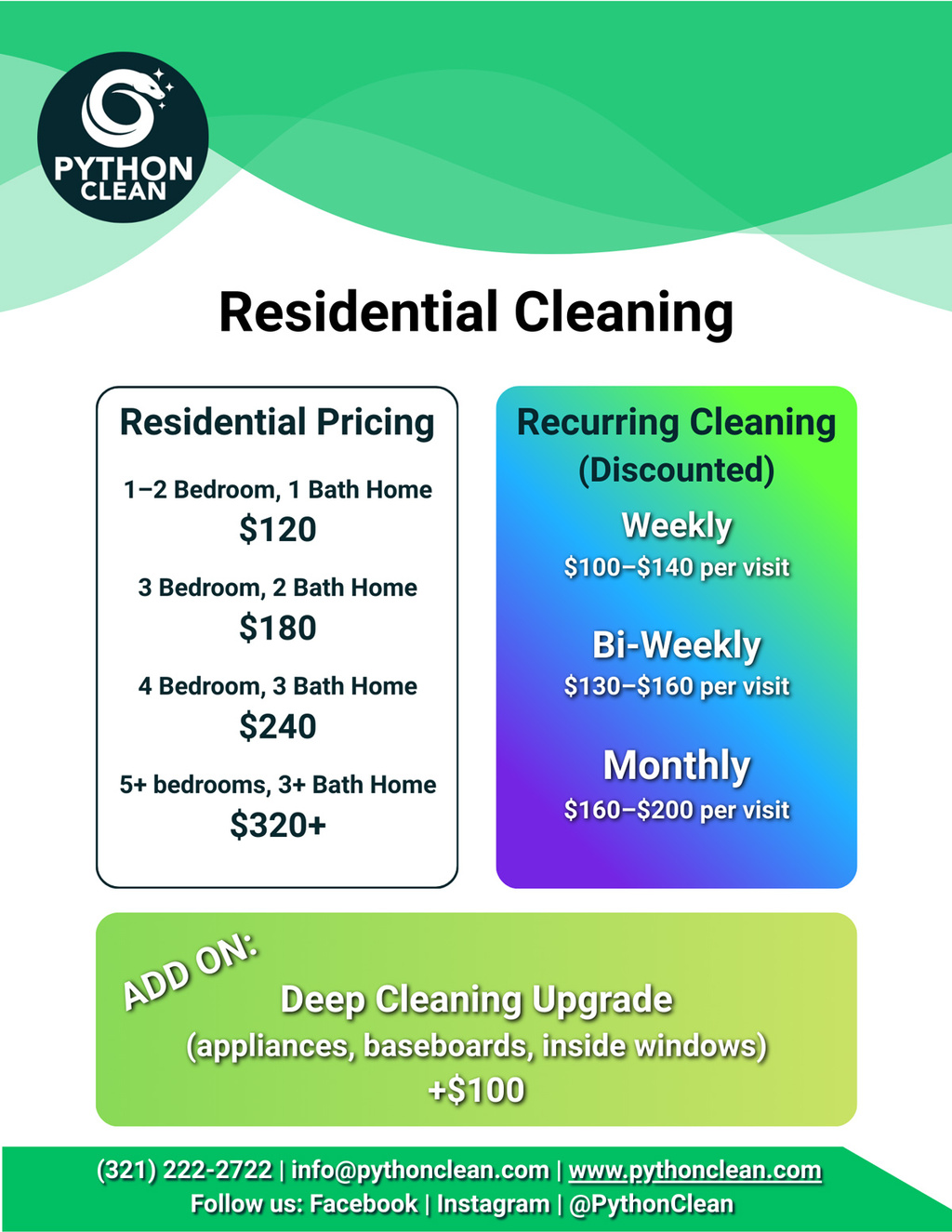 Welcome to Python Clean, your go-to source for spotless, professional cleaning services in Clermont, Davenport, Kissimmee, and beyond. Whether you're moving out, need a one-time deep clean, or want recurring service, we're here to help your space shine.